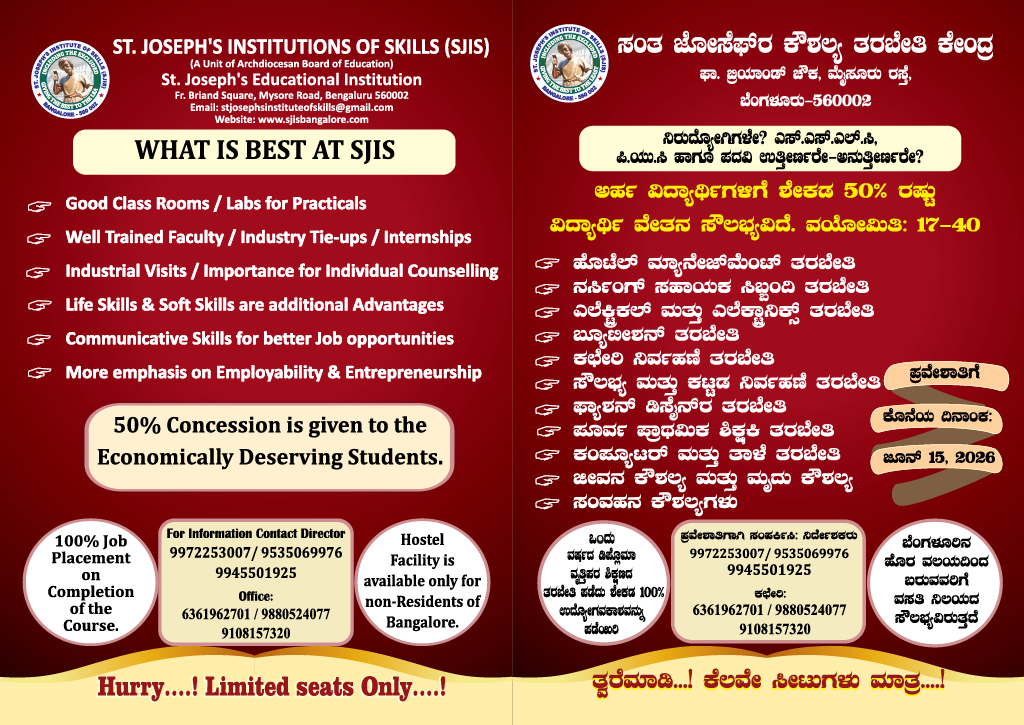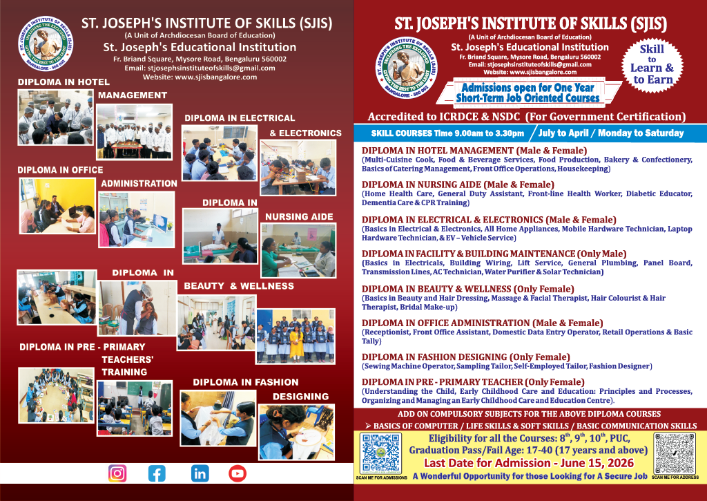“St. Joseph’s Institute of Skills is dedicated in transforming the life of students through the integration of Skills, training and character building”.